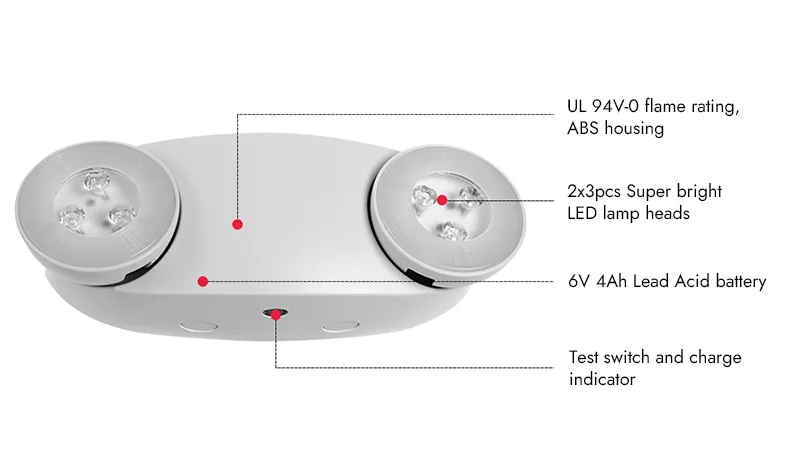 - يحتوي كل رأس على 3 مصابيح LED فائقة السطوع، تعمل تلقائياً عند انقطاع التيار الكهربائي.