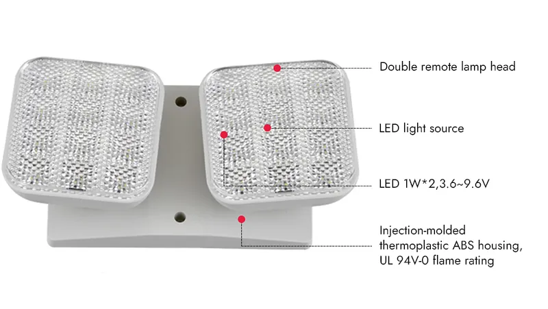 مواصفات عامة | مصباح LED بقدرة 1 واط، يعمل ضمن نطاق جهد مرن من 3.6 إلى 9.6 فولت، مما يجعله مناسباً لمختلف أنظمة الطوارئ منخفضة الجهد. | مصباحي (2) LED بقدرة 1 واط، يعملان ضمن نطاق جهد مرن من 3.6 إلى 9.6 فولت، مما يجعلهما مناسبان لمختلف أنظمة الطوارئ منخفضة الجهد. | ||||